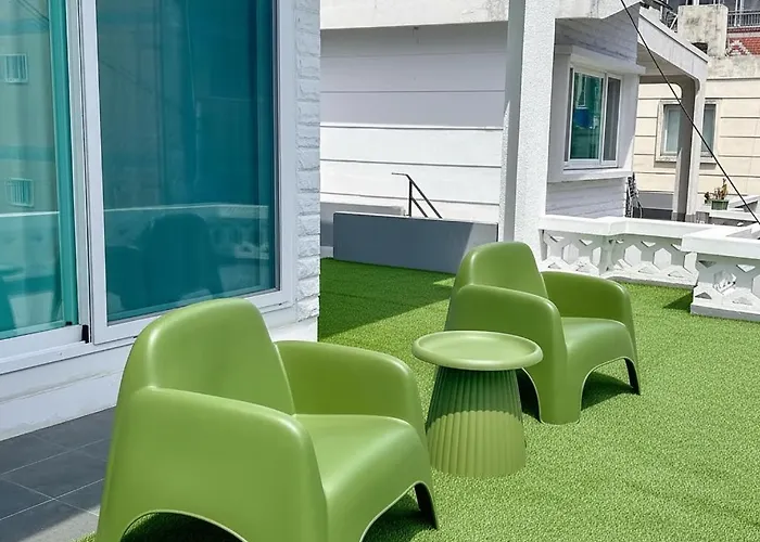 Bij 부산앤유 Busan&U - 광안리해수욕장 도보 5분, 지하철 도보 5분 appartementen kunnen gasten gebruik maken van self-catering voorzieningen, waaronder een ingerichte keuken, en genieten van hun maaltijden in een eetgedeelte. Gwangali Beach bushalte is binnen 10 minuten te voet ervan gelegen. Een terras kijkt uit op de binnenplaats.